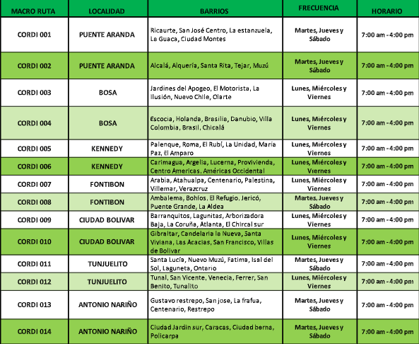 ACTUALMENTE PRESTAMOS EL SERVICIO DE MANERA DOMICILIARIA A TODOS LOS USUARIOS, ESTABLECIENDO UNAS RUTAS, FRECUENCIAS Y HORARIOS, EN LAS SIGUIENTES LOCALIDADES DE BOGOTA D.C, PARA QUE SE ALINEN AL MOMENTO DE HACER LA DISPOSICION DE LOS RESIDUOS GENERADOS EN LOS HOGARES COLOMBIANOS.